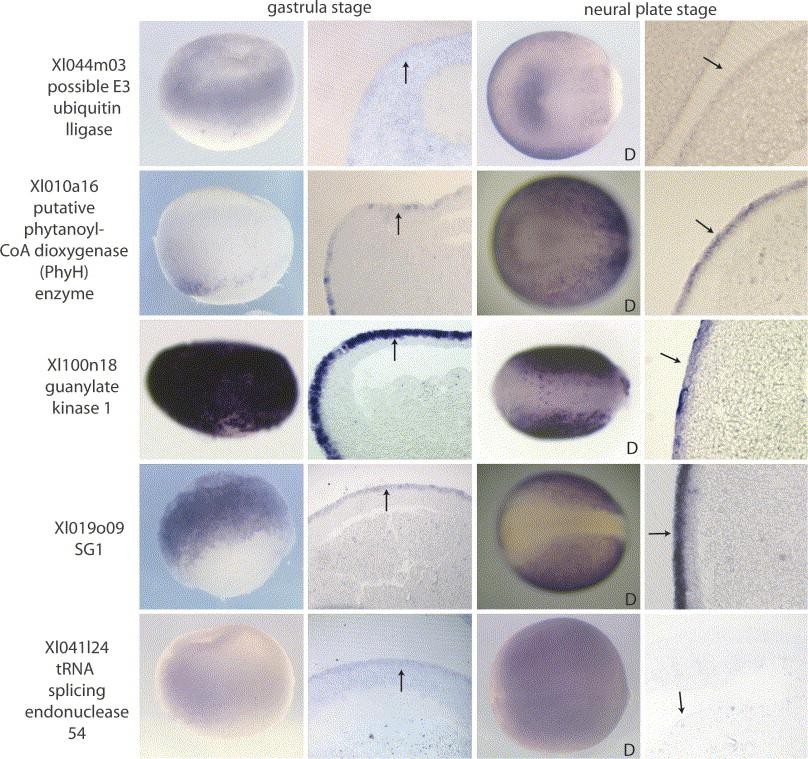 Fig. 5. Genes with superficial expression; Part 5. A wholemount and a section are shown for each gene at gastrula (left-hand panels) and neural plate stage (right-hand panels). The gastrula stage wholemounts have the animal hemisphere to the top. The sections show expression in the animal hemisphere. The stage 14 wholemounts are shown as lateral (L) or dorsal views (D) as indicated with anterior to the left. The stage 14 sections are transverse and show expression in the epidermis except for tRNA splicing endonuclease 54 which is sagittal and shows some weak expression in the archenteron. Arrows indicate areas of expression. The genes are labelled with the top blast hit and unique EST identifier (e.g., Xl044m03).