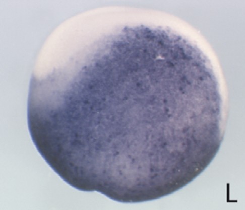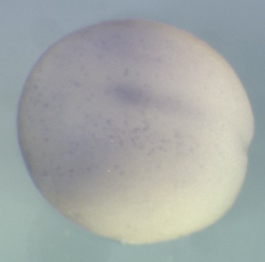 krt70 (keratin 70) gene expression in a Xenopus laevis embryo, NF stage 14, as assayed by in situ hybridization. Dorsal view: anterior left.