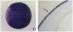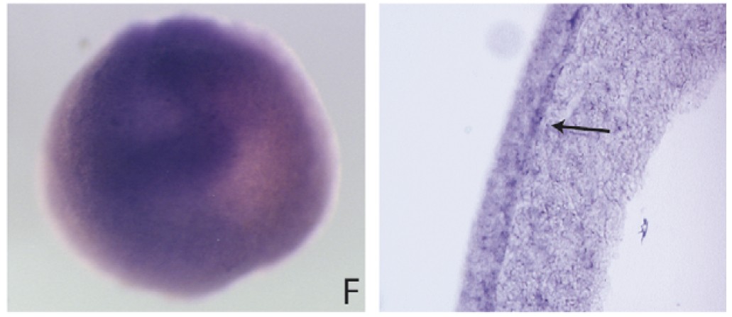 upk3a (uroplakin 3A) gene expression in a Xenopus laevis embryo, NF stage 14, as assayed by in situ hybridization. Left panel, dorsal view, anterior left; right panel transverse section, dorsal up