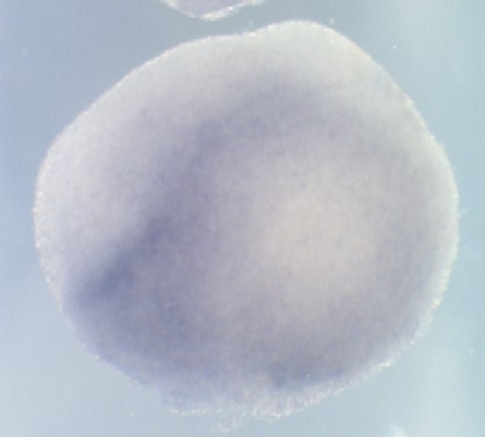 has1 (hyaluronan synthase 1) gene expression in a Xenopus laevis embryo, NF stage 14, as assayed by in situ hybridization. Anterior view: dorsal up.