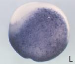 fkbp4 (FK506 binding protein 4, 59kDa) gene expression in a Xenopus laevis embryo, NF stage 14, as assayed by in situ hybridization. Left Panel: Anterior view, dorsal up. Right Panel Transverse section, Dorsal up