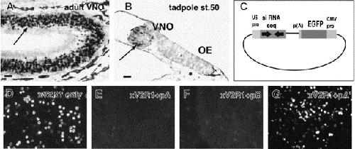 Stable knock-down of vomeronasal receptor genes in transgenic Xenopus tadpoles.