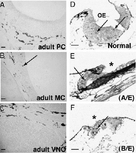 Expression of xOR1 in the olfactory organs. Cross-sections of normal adult principal cavity (PC) (A), middle cavity (MC) (B), VNO (C), the normal OE in the tadpole at stage 50â51 (D), pA/E- (E), and pB/E (F) -derived EGFP-positive tadpoles with fused nostrils. The sections were hybridized with digoxigenin-labeled xOR1-specific antisense probe as described in the Materials and methods. The fused OE (asterisks) and the expression sites of xOR1 (arrows) are shown. Bars indicate 50 μm.