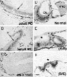 Expression of xOMP-2 in the olfactory organs. Cross-sections of normal adults PC (A), MC (B), VNO (C), the normal olfactory organs in the tadpole at stage 50â51 (D), pA/E- (E), and pB/E (F) -derived EGFP-positive tadpoles with fused nostrils. The sections were hybridized with digoxigenin-labeled xOMP-2-specific antisense probe as described in the Materials and methods. The fused OE (asterisks) and the expression sites of xOMP-2 (arrows) are shown. Bars indicate 50 μm.
