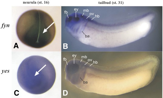 Fig. 4. Detailed expression patterns of Xenopus fyn and yes genes. The fyn gene expression patterns (A,B). Anterior view (A) of Xenopus embryo at neurula stage. The arrow shows the expression of the fyn gene in neural folds. Lateral view (B) of a tailbud (stage 31) embryo. Fyn expression persists in the developing brain, neural tube, eye, branchial arches and otic vesicle. The yes gene expression pattern (C,D). Anterior view (C) of Xenopus embryo at neurula stage. The arrow shows the expression of yes gene in neural folds. Lateral view (D) of embryo at stage 31. The arrows show the major expression of yes gene in the developing brain, neural tube, eye, branchial arches and otic vesicle. hb; hindbrain, mb; midbrain, fb; forebrain, ba; branchial arches, ey; eye, ov; otic vesicle.