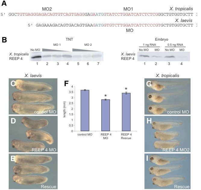 Fig. 3. Inhibition of translation of X. laevis and X. tropicalis REEP4 by antisense morpholino oligonucle- otides. (A) Positions of X. tropicalis MO1 and MO2 and X. laevis MO are indicated in red. The start codon of each open reading frame is shown in blue. (B) Left panel: X. tropicalis REEP4 MO1 and MO2 inhibit translation of REEP4 mRNA in an in vitro transcription-translation reaction. MOs were used at concentrations of 5, 2.5 and 1 μM. Right panel: X. laevis REEP4 MO (90 ng) inhibits translation of REEP4-HA mRNA. The indicated amounts of REEP4 mRNA were injected into embryos of X. laevis at the one-cell stage in the presence or absence of MO. They were cultured to gastrula stage 11 and then processed for Western blotting. (C-I) Rescue of the effects of REEP4 antisense morpholino oligonucleotides. (C-F) Experiments in X. laevis. Embryos were injected with 90 ng control MO (C), 90 ng REEP4 MO (D) or 90 ng REEP4 MO together with 2 ng mRNA encoding X. tropicalis REEP4-HA. There are five base mis-matches between the X. laevis MO and X. tropicalis REEP4. Note the morphological rescue of the REEP4 MO phenotype in (E). (F) Measurements of the lengths of embryos cultured to stage 32 after injection with 90 ng control MO, REEP4 MO, or REEP4 MO together with mRNA encoding X. tropicalis REEP4-HA confirm the ability of REEP4 mRNA to rescue the REEP4 MO phenotype. *Indicates a significant difference in axis length between control MO and REEP4 MO, and between Rescue and REEP4 MO (Student t, P < 0.0001). (G-I) Rescue experi- ments performed in X. tropicalis. Embryos were injected with 30 ng control MO (G) or MO2 (H) or with 30 ng MO2 together with 1.2 ng RNA encoding REEP4-GFP (I).