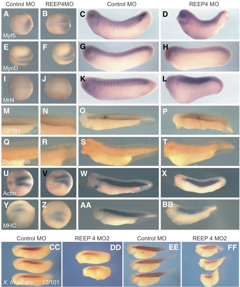 Fig. 5. Activation of muscle markers in embryos lacking REEP4 is normal during neurula stages but their expression becomes disorganised or reduced thereafter. X. laevis (A-BB) or X. tropicalis (CC-FF) embryos were injected, respectively, with 90 ng MO or 30 ng MO2. Control embryos received the same amounts of control MO. They were cultured to neurula or tailbud stages and analysed by in situ hybridisation for expression of Myf5MyoD, Mrf4, the 12/101 epitope, Dystrophin, Cardiac actin and Myosin Heavy Chain. Note in X. laevis that expression of markers at the neurula stage is normal (A,B; E,F; U,V; Y,Z) but that they become disorganised (C,D; G,H; K,L; O,P; S,T) or reduced (W,X; AA,BB) thereafter. The decrease in Cardiac actin expression in the heart in (X) is not a consistent observation. Expression of the 12/101 epitope in X. tropicalis is more sensitive to loss of REEP4 function than is expression in X. laevis. Note the decreased levels of 12/101 staining in (DD) compared with (P).
