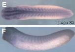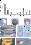 Fig. 2. Expression pattern of Xenopus REEP4. (A) RT-PCR based expression profile of X. laevis REEP4 from stage 1 to tailbud stage 35. Values have been normalized to those of ornithine decarboxylase (ODC). (B-F) Whole-mount in situ hybridisation analysis of X. laevis REEP4 expression. (G-H) Transverse sections of X. laevis embryos at stage 30. Note expression of REEP4 in neural tube, otic vesicles and somites. (I,J) Expression of X. tropicalis REEP4 at tailbud stage 30 and tadpole stage 42. Note strong expression in somites in (I) and in the nervous system in (J). (K,L) REEP4 localises to plasma and nuclear membranes. Embryos at the one-cell stage were left uninjected (J) or received injections of 2 ng RNA encoding C-terminally GFP-tagged REEP4 (I). They were examined at stage 15. Note presence of tagged REEP4 in nuclear and plasma membranes.