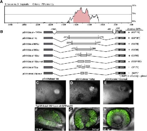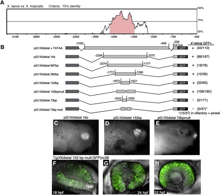 Fig. 1. Identification of a conserved minimal Xath5distal enhancer that promotes retinal expression in vivo. (A) Pairwise mVISTA (http://genome.lbl.gov/vista/index.shtml) analysis of X. laevis and X. tropicalis Xath5 5â² distal noncoding sequences identifies a 1 kb highly conserved region. (B) A series of nested deletion constructs were generated to identify a minimal 152 bp enhancer that is sufficient to promote retinal specific expression. + strong expression, â/+ very weak expression, â no expression (C) A stage 33 pG1X5 distal 1 kb transgenic embryo shows retinal GFP expression. (D) The 152 bp distal enhancer also drives GFP in the retina. (E) A pG1X5 distal 73 bp transgenic embryo does not express GFP in the retina but only expresses in the pineal gland and olfactory placodes. (FâH) The zc38 transgenic zebrafish line exhibits specific expression in the retina as shown in confocal z-projections at 18 hpf (F), 24 hpf (G), 52 hpf (H) Anterior is to the right in all panels.