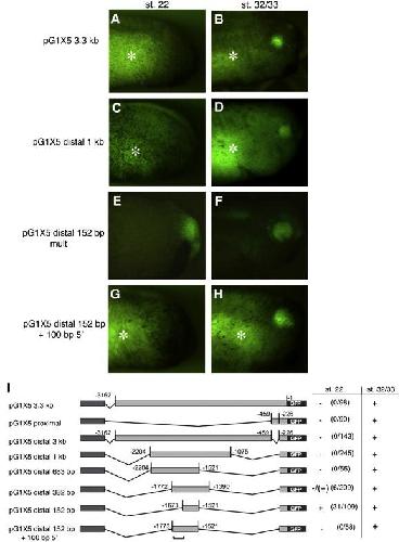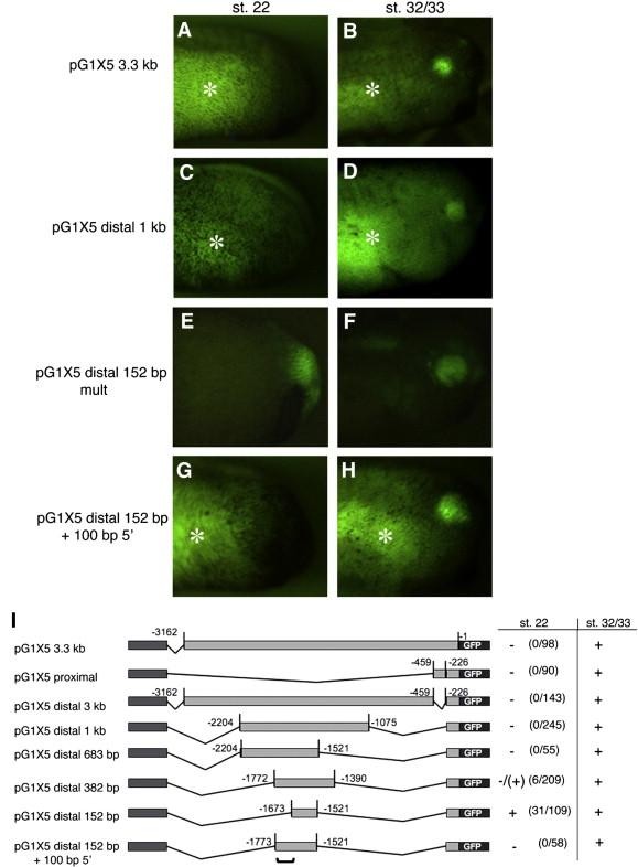 Fig. 2. Expression of the 152 bp distal enhancer is premature compared to endogenous Xath5 expression and an additional 100 bp prevents premature transgene expression. (AâB) pG1 X5 3.3 kb and (CâD) X5 distal 1 kb embryos do not begin expressing GFP in the retina until after stage 22. (EâF) The X5 distal 152 bp mult transgenic embryos express GFP in the retina at both stage 22 and stage 32/33. Addition of 100 bp of sequence 5â² to the distal enhancer prevents premature expression (GâH). Each embryo was imaged at stage 22 and again at stage 32/33. Marks gut autofluorescence. (I) Deletion constructs were assayed for retinal GFP expression at stage 22 identifying a 100 bp region that inhibits precocious expression (marked by bracket). + strong expression, â/+ very weak expression, â no expression.