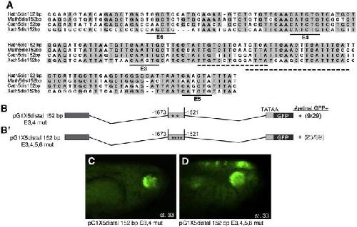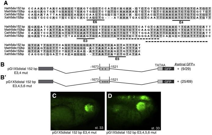 Fig. 3. The 152 bp Xath5distal enhancer does not depend upon conserved E-boxes. (A) ClustalW alignment of the 152 bp distal enhancer sequence between human, mouse, chick and X. laevis shows blocks of highly conserved sequence (gray). Black lines mark the 4 conserved E-boxes in this region (CANNTG). + strong expression. Mutation of E-boxes E3 and E4 (B) or all 4 E-boxes E3âE6 (Bâ²) does not reduce retinal GFP expression in transgenic embryos. (C) A stage 33 pG1X5 distal 152 bp E3,4 mutembryo shows GFP expression in the retina. (D) A stage 33 pG1X5 distal 152 bp E3,4,5,6 mutembryo show GFP expression in the retina as well as ectopic expression in the neural tube and cranial ganglia. Dashed lines mark the 2 overlapping Pax6 sites in the distal enhancer.