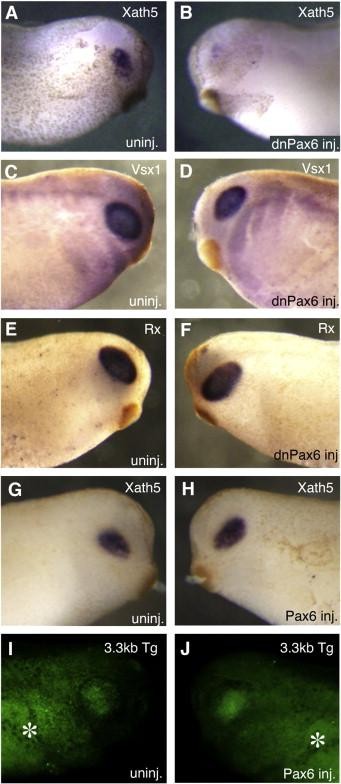 Fig. 4. Pax6 is required for Xath5 expression but is not sufficient to induce Xath5 expression. Overexpression of dnPax6 mRNA decreases Xath5 expression on the injected side (AâB) but does not affect expression of the progenitor markers Vsx1 (CâD) or Rx (EâF). Overexpression of Pax6 mRNA is not sufficient to induce ectopic Xath5 expression (GâH) or ectopic pG1X5 3.3 kb transgene expression (IâJ). Gut autofluorescence.