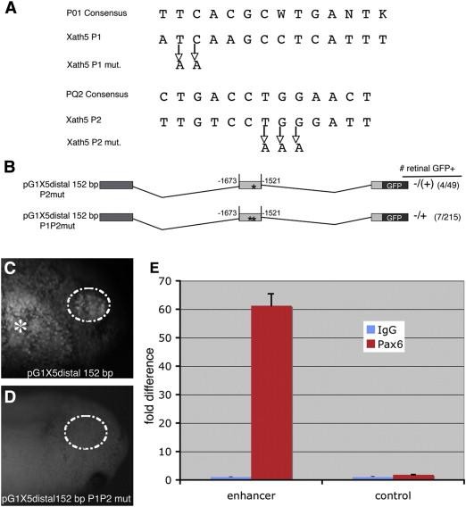 Fig. 5. Expression of the 152 bp distal enhancer is dependent upon conserved Pax6 sites and Pax6 binds to this region in vivo. (A) Sequence from the Xenopus laevis 152 bp enhancer region showing the 2 overlapping Pax6 sites identified using Transfac MATCH version 10.3 (http://www.gene-regulation.com/pub/databases.html#transfac). P1 aligns with the Pax6_01 matrix, while P2 aligns with the Pax6_Q2 matrix. (B) Mutation of one Pax6 site dramatically reduces (â/+) while mutation of both Pax6 sites in the 152 bp distal enhancer results in retinal GFP expression in only a few cells (â/(+)) in transgenic embryos. (C) A stage 33 pG1X5 distal 152 bp transgenic embryo shows strong GFP expression in the retina. (D) A stage 33 pG1X5 distal 152 bp P1P2 mut transgenic embryo does not have retinal GFP expression. (E) ChIP showing Pax6 binds to the distal enhancer region in vivo (group student t test PÂ =Â 0.002 for enhancer region (IgG vs. Pax6 antibody), and 0.056 for the GFP coding region (IgG vs. Pax6 antibody)). Error bars represent standard deviation. Gut autofluorescence.