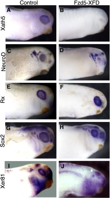 Fig. 6. Endogenous Xath5 expression is regulated by FGF signaling. Stage 28 Fzd5-XFD transgenic embryos show decreased expression of bHLH transcription factors Xath5 (B), NeuroD (D) vs. non-transgenic controls (A, C). The expression of retinal progenitor genes Rx (EâF), and Sox2 (GâH) is not affected. Retinal expression of Xer81 is inhibited in Fz5-XFD transgenic embryos (J) vs. non-transgenic controls (I).