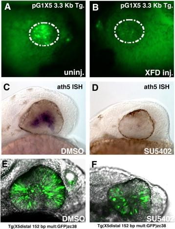 Fig. 7. FGF signaling acts to regulate Xath5 expression through the 3.3 kb enhancer sequence but this effect is not mediated via the 152 bp distal enhancer. Overexpression of XFD mRNA in pG1 X5 3.3 kb transgenic embryos inhibits transgene expression on the injected side (AâB). Ath5 expression is blocked in zebrafish embryos treated with SU5402 vs. DMSO treated embryos (CâD). zc38 transgenic embryos treated with SU5402 express GFP throughout the retina, similar to DMSO treated controls (EâF).