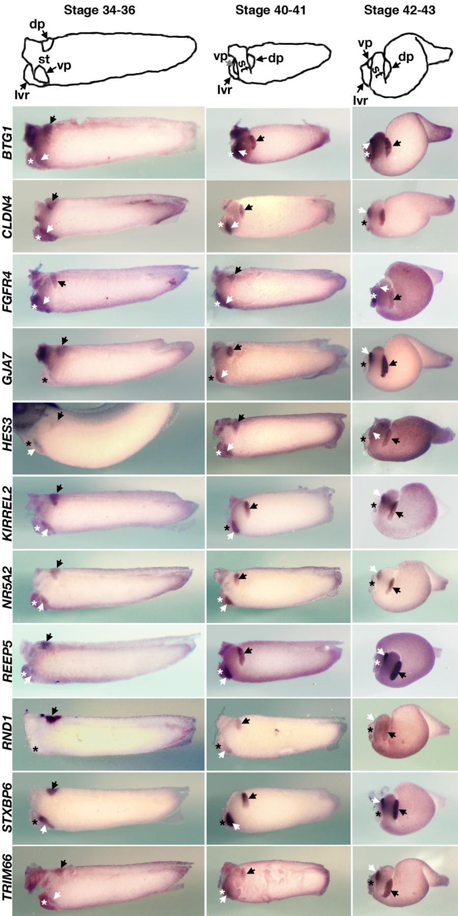Figure 2. Expression of novel pancreatic genes in dissected guts of tadpole stage embryos. Gene expression patterns were revealed by whole-mount in situ hybridization at three representative stages, stage 34-36, stage 40-41, and stage 42-43. These genes are expressed in the pancreatic rudiments of stage 34-36 embryos. The dorsal and ventral pancreatic buds are indicated with the black and white arrows, respectively and the liver bud is marked by an asterisk. A whole embryo was shown for HES3. While the Xenopus laevis gene designated here as HES3 (also known as Xenopus ESR2) has a best blastP match to human HES5, blastN to X. tropicalis and synteny relations identifies it as a gene distinct from tropicalis hes5 called hes3. Anterior to the left, dorsal to the top.