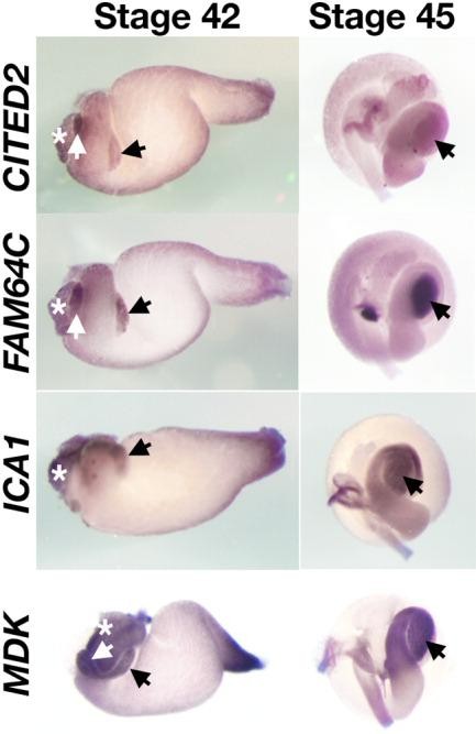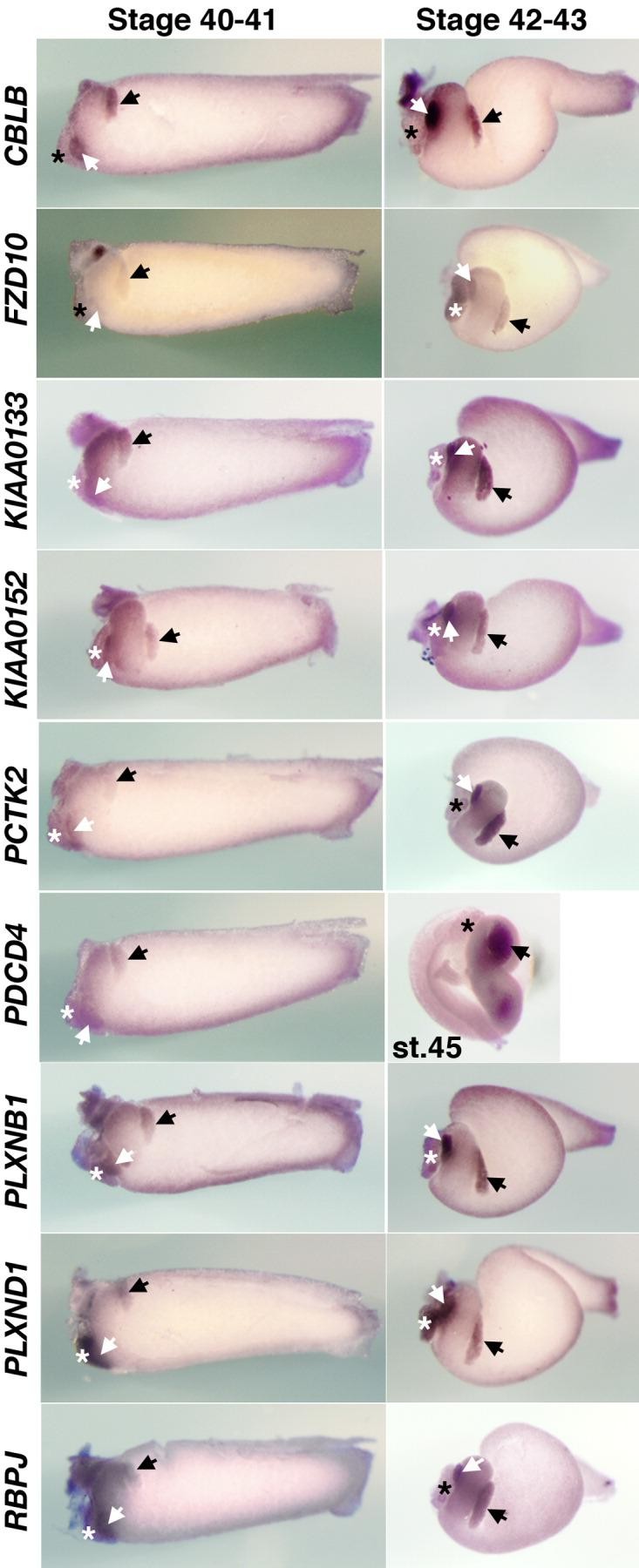 Figure 3. Expression of novel pancreatic genes in the gut of stage 40-43 embryos. The dorsal and ventral pancreatic buds are indicated with the black and white arrows, respectively and the liver bud is marked by an asterisk. Programmed Cell Death Protein 4 (PCDP) expression shown is a stage 45 embryo.