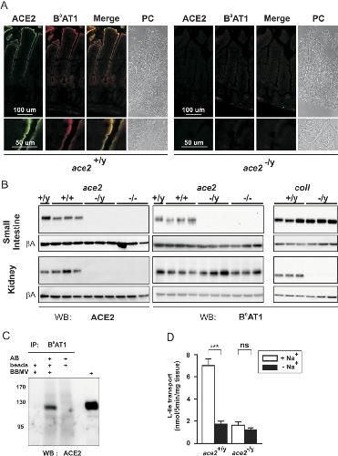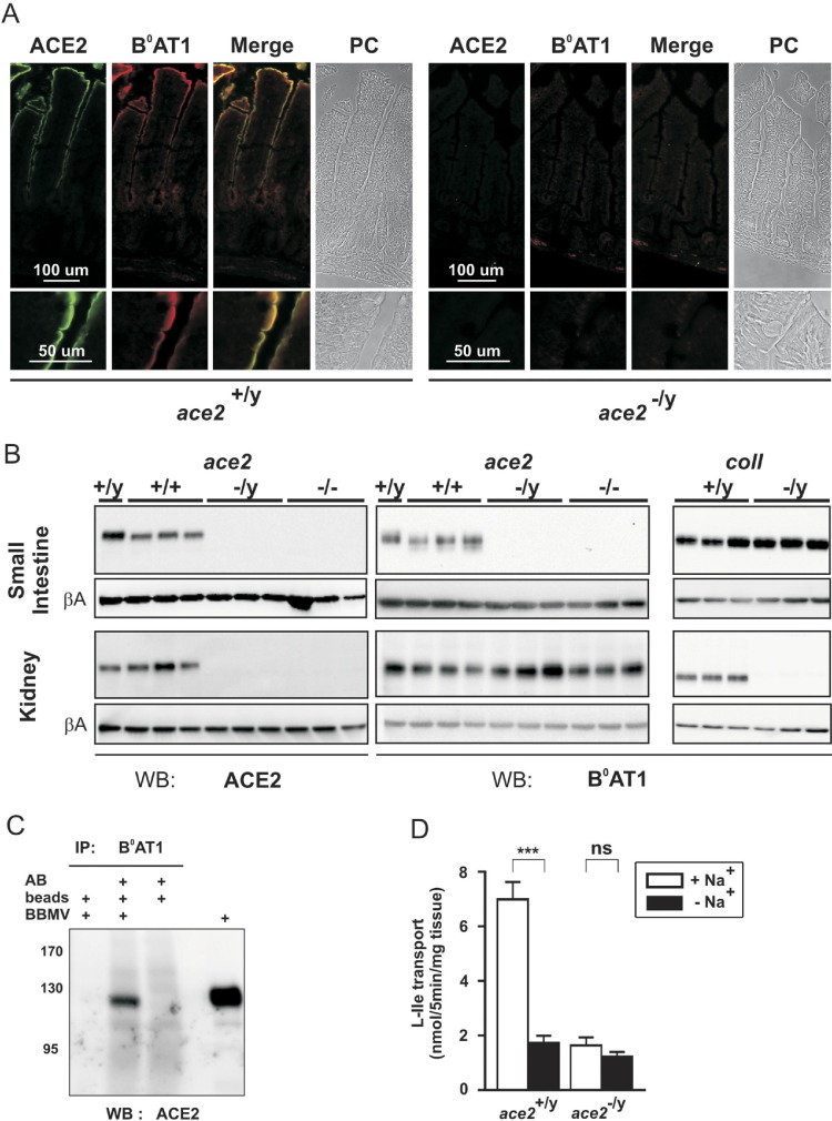 Figure 1. ACE2 and B0AT1 colocalization and functional interaction. (A) Immunofluorescence analysis shows that B0AT1 protein expression is lost in small intestine of ace2-null mice. Small intestine sections from ace2+/y and ace2â/y were colabeled with antibodies against ACE2 (green) and B0AT1 (red) and additionally viewed by phase contrast (PC). (B) Western blot analysis shows that B0AT1 is absent in small intestine but present in kidney brush border membranes of ace2-null mice, whereas B0AT1 is expressed in small intestine and absent from kidney brush border membranes in collectrin-null mice. The loading of brush border membranes (2.5â20 μg) was tested using a β-actin antibody (βA). Note that male ace2+/y or ace2â/y and female ace2+/+ or ace2â/â mice were used with similar results. (C) Coimmunoprecipitation shows interaction of ACE2 with B0AT1 in mouse small intestine. Complexes were immunoprecipitated (IP) from small intestine brush border membrane vesicles (BBMVs) using anti-B0AT1 antibody (AB) and analyzed by Western blot (WB) using anti-mouse ACE2 antibody. (D) Na+-dependent uptake of l-isoleucine (L-Ile) is abolished in ileum segments from ace2â/y mice. The transport was measured in the presence (white bar) and in the absence (black bar) of sodium. Data points represent mean values of 4 intestinal ring uptakes from independent experiments ± SEM, ***P < .001. ns, not significant.