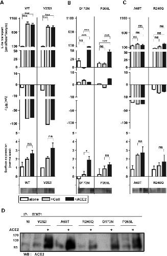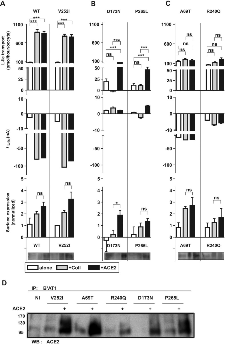 Figure 2. Differential function of Hartnup mutations coexpressed with collectrin or ACE2 in X laevis oocytes. Wild-type and mutant human B0AT1 are shown in this figure as 3 groups with different functional characteristics and labeled AâC. (A) The transport function and the surface expression of both wild-type and nonsynonymous SNP V252I of B0AT1 are increased by coexpression with human collectrin or mouse ACE2. (B) The relatively low transport activity of B0AT1 D173N and P265L mutants expressed alone is increased by coexpression with ACE2 but not with collectrin. The surface expression of the D173N mutant is also significantly increased by coexpression with ACE2. (C) The wild-typeâlike function of the A69T or R240Q mutants expressed alone is not increased in the presence of collectrin or ACE2, although in the case of A69T its surface expression is increased. The upper panels of AâC show the transport function measured as radiolabeled l-isoleucine (L-Ile) uptake (means ± SEM of 13â31 oocytes from 3 independent experiments), and the middle panel shows the transport function as current measured by TEVC (9â11 oocytes from 3 batches). *P < .05, ***P < .001. The lower panels show the surface expression assayed by Western blot using surface-biotinylated proteins and a representative Western blot. The data correspond to the means ± SEM (n = 3â5 independent experiments) of the results normalized to the value obtained for B0AT1 expressed alone. For the transport experiments, the significance was evaluated using analysis of variance with Tukey posttest and for the surface biotinylation the comparison of means was performed by unpaired t test. (D) B0AT1 and the mutants D173N, P265L, R240Q, and A69T interact with ACE2 in X laevis oocytes. The transporters expressed alone or together with human ACE2 were immunoprecipitated (IP) from oocyte lysates using anti-human B0AT1 antibody and complexes were analyzed by Western blot (WB) using anti-human ACE2 antibody. NI, noninjected.