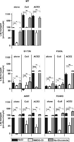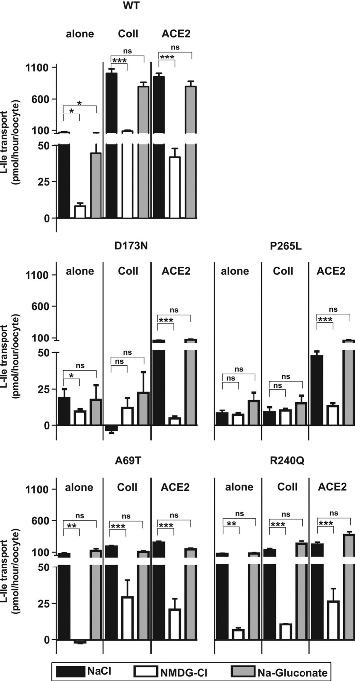 Figure 3. The ion dependency of D173N, P265L, A69T, and R240Q coexpressed with ACE2 or collectrin is not altered; transport is Na+ but not Clâ dependent. Wild-type human B0AT1 (WT) and the mutants D173N, P265L, A69T, and R240Q were expressed alone or with human collectrin or mouse ACE2. The ion dependence was tested by substituting Na+ with N-methyl-d-glucamine (NMDG) and substituting Clâ with gluconate. Function was assayed by influx of radiolabeled l-isoleucine (L-Ile). For each mutation, 3 independent experiments (15â24 oocytes) were pooled. Comparison of means was performed by analysis of variance with Tukey as posttest. Data represent means ± SEM. *P < .05, **P < .01, ***P < .001. ns, not significant.