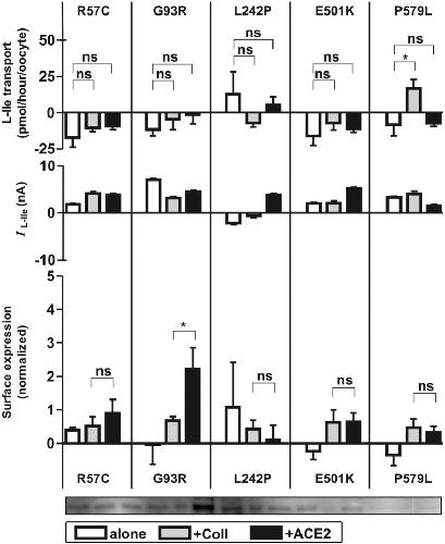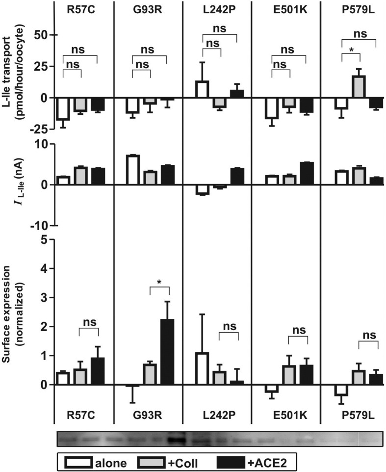 Figure 4. The B0AT1 mutants R57C, G93R, L242P, E501K, and P579L exhibit no transport activity when expressed alone or coexpressed with collectrin or ACE2. Function was assayed by influx of radiolabeled l-isoleucine (L-Ile) (upper panels) or TEVC (middle panels). For each mutant, 3 independent experiments (13â31 oocytes for influx and 9â11 for TEVC) were pooled. Comparison of means was performed by analysis of variance with Tukey as posttest. Data represent means ± SEM. ns, not significant. Cell surface expression of labeled proteins (lower panels) was analyzed by Western blot. The bands were quantified and data normalized to the values obtained from oocytes expressing B0AT1 proteins alone. For each mutation, 3 to 4 independent experiments were pooled. Comparison of means was performed by unpaired t test. Data represent means ± SEM. *P < .05. ns, not significant.