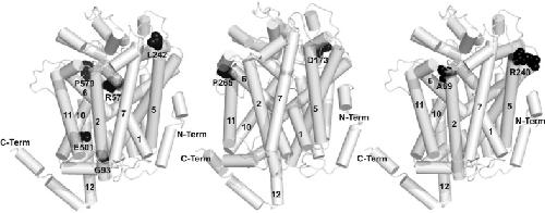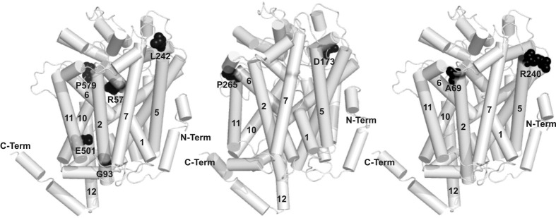 Figure 5. Missense mutations in the SLC6A19 gene causing Hartnup disorder. The model of B0AT1 is based on the Slc6 bacterial homologue from Aquifex aeolicus LeuTAa16 and the transmembrane segments are numbered. The localization of mutations causing a loss of surface expression (R57, G93, L242, E501, P579) is depicted in the left panel. The sites of mutations leading to a differential interaction with the 2 accessory proteins (D173 and P265) are depicted as black spheres on the middle panel, and the sites of the mutations preventing both accessory proteins of stimulating the transport function are depicted on the right panel (A69 and R240).