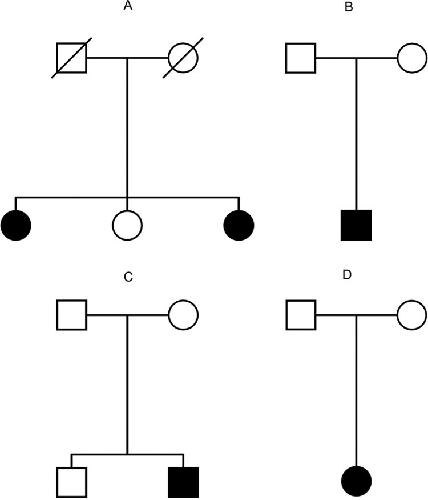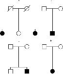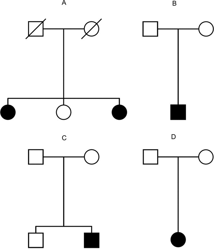 Supplementary Figure 3. Pedigrees of 4 families with new Hartnup disorder mutations. (A) Danish pedigree: 2 of 3 siblings were compound heterozygous for P265L and L242P. The symptoms observed were quite diverse between the 2 sisters. The younger one was diagnosed with Hartnup disorder in early childhood due to pellagra-like skin rash and an atactic gait that improved with administration of niacin.1 The older affected sibling never showed skin pathologies or ataxia. (B) Another Danish pedigree, where the only child affected was a compound heterozygous for A69T and the original Hartnup mutation IVS8+2TâG. This patient was the first child of unrelated parents and was diagnosed at 1 year of age after a suspected seizure prompted a metabolic screening of urine. Plasma amino acids and electroencephalography were normal. The patient subsequently had normal growth and development without epilepsy, ataxia, or pellagra. (C) The other Danish patient was a compound heterozygous for P579L and the original Hartnup mutation IVS8+2TâG. This patient was the second child of unrelated parents and was diagnosed at 2 years of age after onset of partial complex epilepsy with great difficulty to control seizures. The patient had normal plasma amino acids and never had ataxia or pellagra. (D) Another patient from a German family was diagnosed as homozygous for the new missense mutation G93R. This patient was diagnosed at 6 years of age during a migraine workup and also never had ataxia or pellagra. The affected subjects are depicted as filled symbols.