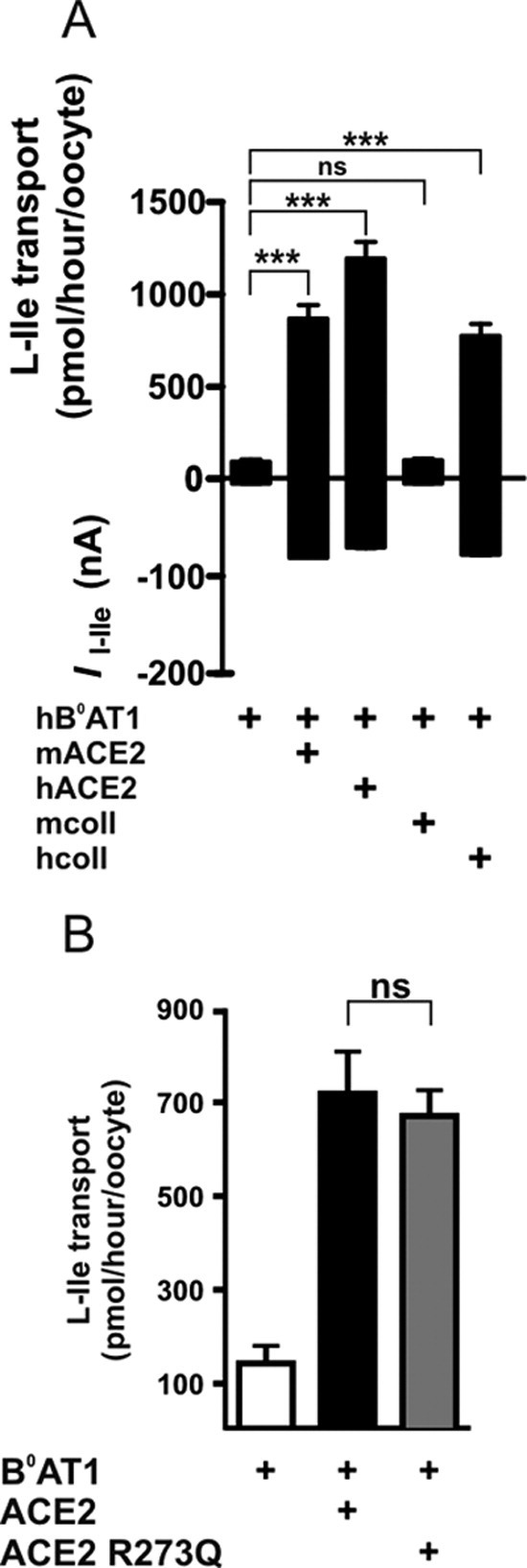 Supplementary Figure 1. Function of human B0AT1 coexpressed with orthologues of collectrin and ACE2 in X laevis oocytes. (A) Coexpression of ACE2 or human collectrin increases B0AT1 function in X laevis oocytes. Tracer flux experiments (upper graph, n = 16â32) and TEVC (lower graph, n = 11) show that human B0AT1 (hB0AT1) coexpressed with human ACE2 (hACE2), mouse ACE2 (mACE2), or human collectrin (hColl) transports l-isoleucine more efficiently than when expressed alone or in combination with mouse collectrin (mColl). Data points represent means ± SEM. ***P < .001. ns, not significant. (B) Human B0AT1 function is increased by coexpressed human ACE2 independent of its protease activity. The protease-dead human ACE2 mutant (ACE2 R273Q) stimulated the human B0AT1-mediated l-isoleucine influx to the same extent as wild-type human ACE2. Data points represent means ± SEM (n = 15â16). ns, not significant.