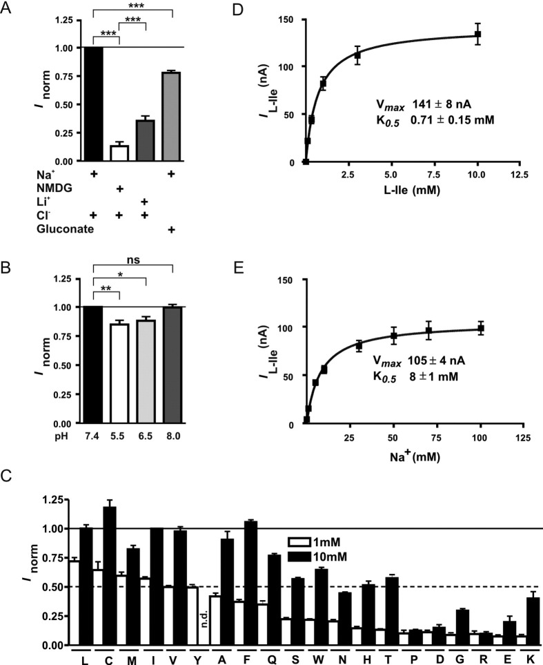 Supplementary Figure 2. Functional characterization of the complex formed by human B0AT1 and ACE2 in X laevis oocytes. (A) The amino acid transport by human B0AT1 coexpressed with mouse ACE2 in X laevis oocytes is Na+ but not Clâ dependent. The ion dependence was tested by substituting Na+ by N-methyl-d-glucamine (NMDG) or Li+ and Clâ by gluconate in the superfusion solution used for TEVC. The values were normalized to the current obtained by superfusion of the oocytes with 10 mmol/L l-isoleucine in solution containing Na+ and Clâ (Inorm). Comparison of means was performed by analysis of variance with Tukey as posttest. Each data point represents the mean ± SEM (n = 16). ***P < .001. (B) Amino acid transport by human B0AT1 coexpressed with mouse ACE2 in X laevis oocytes is maximal at neutral pH. The pH dependence of the transport was measured by TEVC in oocytes clamped at â50 mV and superfused with Na+ solution buffered at pH 5.5, 6.5, 7.4, or 8.0. Values were normalized to the current obtained by superfusion of oocytes with 10 mmol/L l-isoleucine in solution pH 7.4 (Inorm). Comparison of means was performed by analysis of variance with Tukey as posttest. Each data point represents the mean ± SEM (n = 9). *P < .05, **P < .01. (CâE) Human B0AT1 coexpressed with ACE2 transports a broad range of neutral amino acids with low affinity. (C) The substrate selectivity of human B0AT1 coexpressed with mouse ACE2 was measured by TEVC in oocytes clamped at â50 mV and superfused with Na+ solution containing 1 mmol/L (white bars) or 10 mmol/L (black bars) of amino acids. The currents induced by the amino acids were normalized to the currents obtained in oocytes perfused with 10 mmol/L l-isoleucine (Inorm). Data are shown as mean values ± SEM (n = 8â11) and the amino acids are indicated in single letter code. (D and E) The K0.5 and Vmax for l-isoleucine and Na+ of human B0AT1 coexpressed with mouse ACE2 was estimated using TEVC. For the Na+ concentration dependence experiments, the cells were first equilibrated with the indicated Na+ concentration (0, 1, 5, 10, 30, 50, 70, and 100 mmol/L) before the perfusate containing l-isoleucine (10 mmol/L) was applied. For the l-isoleucine concentration dependence experiments, the cells were perfused with increasing concentrations of l-isoleucine (0.1, 0.3, 1, 3, and 10 mmol/L). The continuous line is the nonlinear regression fit of the MichaelisâMenten equation to the data. Each data point represents the mean ± SEM (C, n = 26â27; D, n = 10â22).