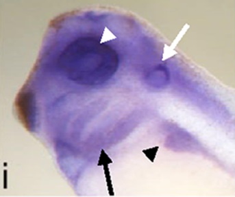 hipk1 (homeodomain interacting protein kinase 1) gene expression in Xenopus laevis embryo, assayed via in situ hybridization, NF stage 17, anterior view, dorsal up. |