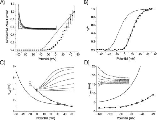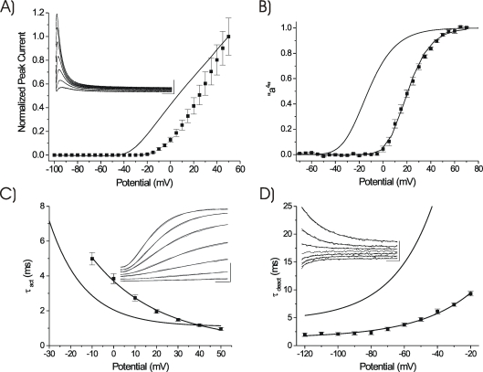 Figure 1. Activation and Deactivation Characteristics.A) Main Panel: Comparison of normalized (peak values at +50 mV) mean peak transient I–V relationships for V287R (n = 8) and WT Kv4.3, from [16]. HP = −100 mV, currents elicited by one second depolarizing pulses, and mean peak transient current defined as peak current minus residual current at the end of the depolarizing pulse. V287R mean peak current amplitude at +50 mV = 903±141 nA. Inset: Representative current waveforms for V287R elicited in response to depolarizing voltage clamp pulses applied from −10 mV to +50 mV, 10 mV increments. Calibration bar: 200 nA, 50 ms. B) Mean steady-state activation curve “a4” fit as a fourth order Boltzmann relationship (V1/2 = 1.40 mV, k = 11.62 mV, n = 11). Mean WT “a4” relationship: V1/2 = −36 mV, k = 14.50 mV, from [9]. C) Main Panel: V287R activation kinetics (n = 11). Curve fits (single exponential functions) to mean data points: τact = 4.84e10−mV/30.9+0.20 ms. Inset: Representative fits of V287R “a4” activation kinetics elicited during depolarizing pulses from −10 to +50 mV, 10 mV increments, HP = −100 mV. τact = 1.1, 1.4, 1.9, 2.5, 4.2, 5.2, 7.7 ms, −10 to +50 mV, respectively. Calibration bar: 200 nA, 1.0 ms. D) Main Panel: V287R deactivation kinetics (n = 12). Curve fits (single exponential functions) to mean data points: τdeact = 0.18emV/32.7+1.40 ms. Inset: Representative single exponential fits of V287R deactivation kinetics from −40 to −100 mV, 10 mV increments, HP = −100 mV. τdeact = 4.9, 3.9, 3.6, 2.7, 2.8, 2.2 ms, −40 to −100 mV, respectively, −70 mV not fit. Calibration bar: 50 nA, 3.0 ms. WT data in panels C) and D) from [9].