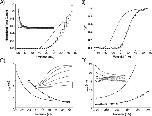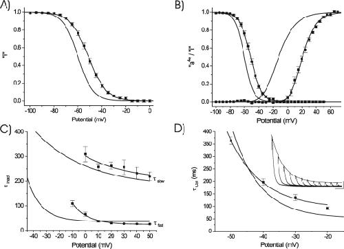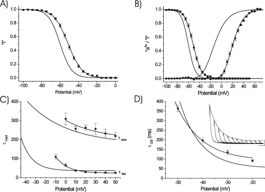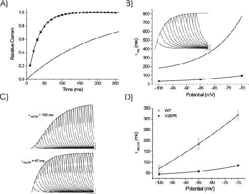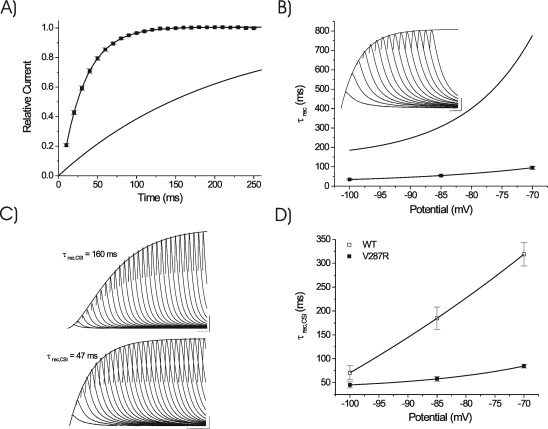 Figure 3. Recovery Characteristics.A) WT and V287R macroscopic recovery kinetics (HP = −100 mV) developed during a one second pulse to +50 mV. Mean mutant data points (n = 7) fit as a single exponential function with τrec = 30.10 ms. WT τrec = 206 ms, data from [9]. B) Main Panel: Comparison of the voltage dependence of mean τrec values of V287R and WT, from [9], [10], [16], [25]. At all HPs, macroscopic recovery kinetics were significantly faster for V287R than for WT. Curve fits: WT: τrec = 23.89emV/11.14+142.10 ms, V287R: τrec = 9.42emV/21.77+13.95 ms. Inset: Representative macroscopic recovery waveforms for V287R (P2 currents at +50 mV). Peak data points fit with a single exponential relationship with time constant = 32 ms. Calibration bar: 200 nA, 20 ms. C) Representative recordings of recovery (HP = −85 mV) from closed-state inactivation for WT (upper panel, fit as an “a2” formulation) and V287R (lower panel, exponential fit). Calibration bars: WT: 1 µA, 50 ms, V287R: 500 nA, 50 ms. D) Voltage dependence of mean τrec,csi values for WT (hollow squares, n = 5) and V287R (solid squares, n = 7). Curve fits: WT: τrec,csi = 248.50emV/93.1−582.10 ms, V287R: τrec,csi = 5.80emV/19.77+34.10 ms.