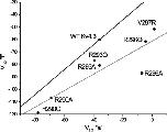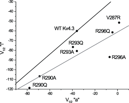 Figure 4. Summary of all Kv4.3 S4 mutant data collected to date: “i” V1/2 values as a function of “a” V1/2 values.The solid black line (centered on WT) is a linear relationship with slope = 1.0, as predicted from previous work on Shaker channels [26]. The solid gray line is a best fit to all mutant data points (WT excluded, slope = 0.65, mean R→A/Q data points from [9], [10]). All ΔV1/2 shifts were less than those predicted from Shaker.
