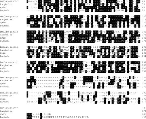 Figure 4. Comparison of Pix proteins in Ecdysozoa.ClustalW was used to compare the Pix proteins of Drosophila melanogaster (Insecta, Diptera), Anopheles gambiae (Insecta, Diptera) Apis melifera (Insecta, Hymenoptera), Daphnia pulex (Crustacea, Cladocera). Details as in Figure 3.