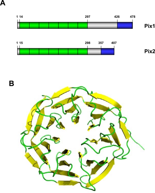 Figure 1. Pix protein organization.A. A schematic diagram of the two human Pix proteins with amino acid numbers indicated. Pix proteins consist of an N-terminal domain containing seven WD40 repeats (green) and a highly conserved C-terminal coiled-coil (blue). B. A model of the Pix protein WD40 repeat domain folded to form a β-propellor. The structural model was built using MODELLER with the structure of the WDR5 protein (pdb-entry: 2GNQ) serving as a template. The figure was generated in pymol.