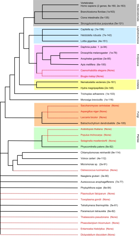 Figure 2. Pix proteins across eukaryotes.A cladogram of a wide range of organisms is drawn according to the current, generally accepted consensus. Pix genes were identified by BLAST search of genomes and identified as hits to the N-terminal 7 WD-40 repeats and the C-terminal coiled-coil region. When these proteins were in turn used to search all genomes their closest vertebrate homologues were Pix proteins. The presence of Pix genes in the genome is indicated by black entries and their absence by red. Pix sequences were compared to Xenopus laevis Pix2 by pairwise BLAST and the P-value for the match is shown.
