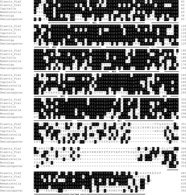 Figure 3. Sequence alignments of Pix proteins from representatives of major animal groups compared by ClustalW.Nematostella vectensis (Cnidaria, Anthozoa); Capitella sp. (Lophotrochozoa, Annelida); Drosophila melanobaster (Ecdysozoa, Arthropoda); Xenopus laevis, with two Pix genes (Deuterostomata, Vertebrata); Monosiga brevicollis (Choanoflagellida). Identical amino acids blocked in black and domains are identified according to the Nematostella sequence, using the programs SMART and Coils at EMBL-EBI.
