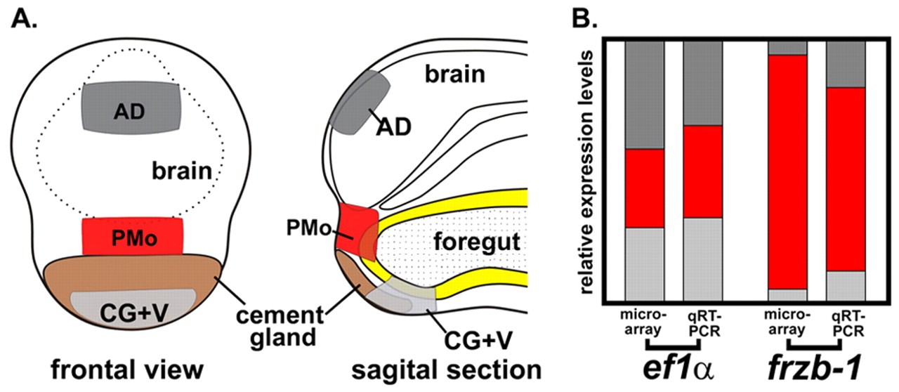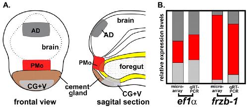 Fig. 1. Schematic summarizing microarray screen for genes whose expression is enriched in the primary mouth anlage. (A) Regions microdissected for RNA collection: anterior dorsal region (AD, dark gray), ventral region including the cement gland (CG+V, light gray) and the presumptive primary mouth (PMo, red). Foregut epithelium is shown in yellow. (B) Expression of frzb-1 and ef1-alpha in the primary mouth (red) relative to flanking regions (88%, microarray; 71%, qRT-PCR). |