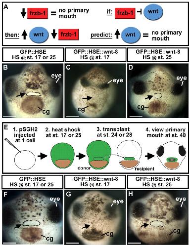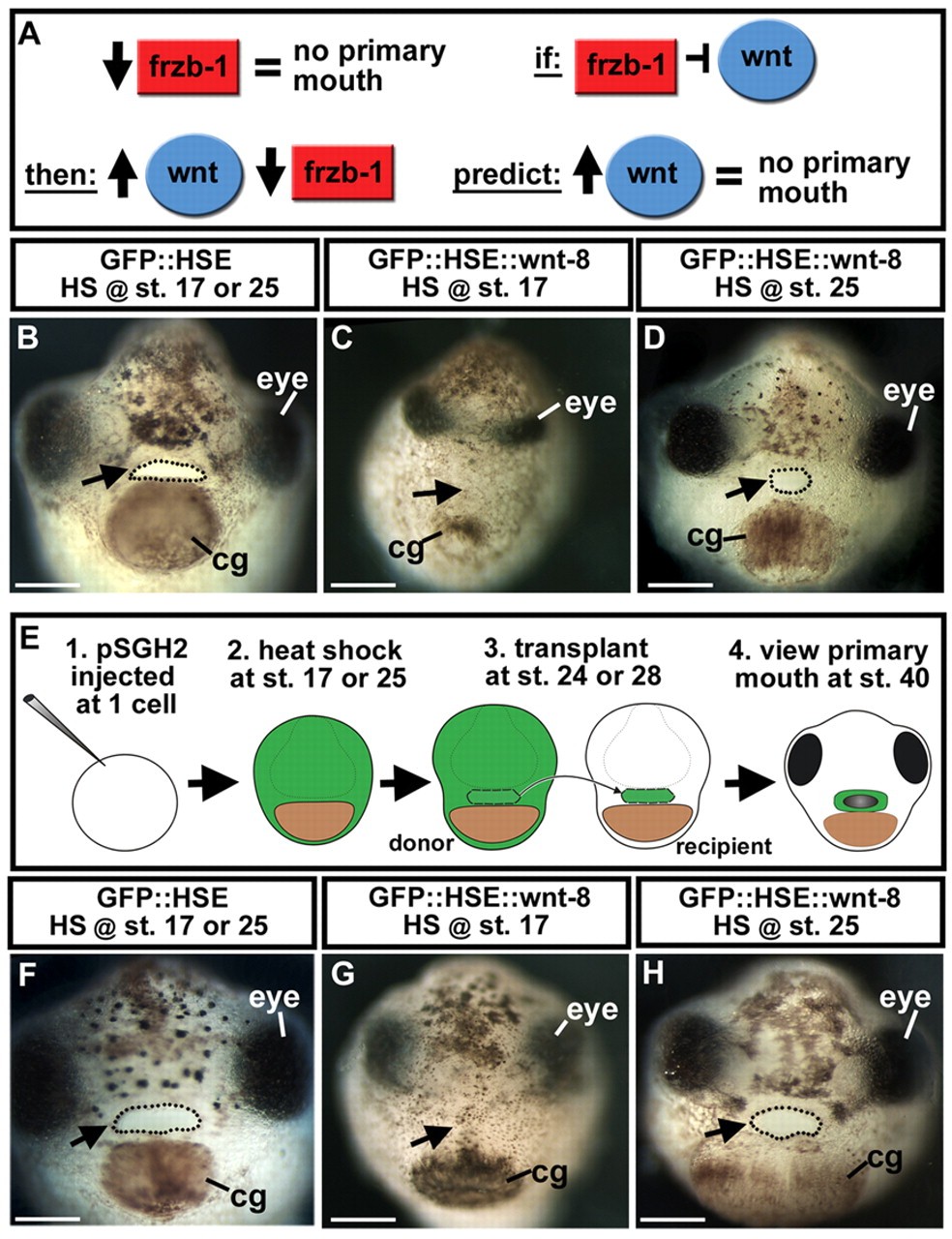 Fig. 4. Temporal and spatial overexpression of wnt-8 under control of a heat-shock promoter element (HSE) and using ectoderm transplants. Frontal views are shown, assayed at stage 40 in two to three independent experiments. Open primary mouth, black dotted line; cg, cement gland; pSGH2, ISceI-GFP-HSE plasmid. Arrows indicate the primary mouth or region where it would form. Scale bars: 250 μm. (A) Schematic showing prediction that if Frzb-1/Cresent inhibits Wnt signaling, increased Wnt-8 would phenocopy loss of Frzb-1/Crescent. (B) Injected with GFP::HSE followed by heat shock at either stage 17 or 25 has no effect on primary mouth formation (90%, n=50). (C) Injection of GFP::HSE::wnt-8 and heat shock administered at stage 17 results in neither a stomodeum nor a primary mouth (97%, n=65). (D) Injection of GFP::HSE::wnt-8 and heat shock administered later (stage 25-28) results in a normal primary mouth (47%) or a slightly smaller one (53%, n=32). (E) Schematic of experimental design using ectoderm transplants. (F) Control (GFP::HSE): when heat shock was administered at stage 17 and transplants performed at stage 24, recipients form a primary mouth (100%, n=12). The same is true if heat shock is administered at stage 24 and transplants are performed at stage 28 (n=10). (G) GFP::HSE::wnt-8: when heat shock was administered at stage 17 and transplants performed at stage 24, 83% of the recipients do not form a stomodeum or a primary mouth (n=12). (H) When the experiment in G was performed later, 88% formed a normal primary mouth (n=9). |