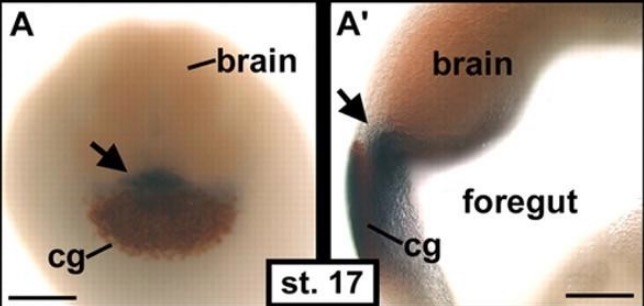 frzb (frizzled related protein) gene expression in Xenopus laevis embryo, assayed via in situ hybridization, NF stage 26, (C) anterior view, dorsal up, and (C') in midsaggital section, anterior left, dorsal up.. Co-staining: muc2 (mucin 2, oligomeric mucus/gel-forming) marks cement gland (cg), and nrp1( neuropilin 1) marks brain and eyes in light orange.; arrows indicate the position of the presumptive primary mouth. |