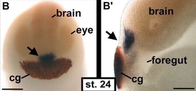 frzb (frizzled related protein) gene expression in Xenopus laevis embryo, assayed via in situ hybridization, NF stage 24, (B) anterior view, dorsal up, and (B') in section. Co-staining: muc2 (mucin 2, oligomeric mucus/gel-forming) marks cement gland (cg), and nrp1( neuropilin 1) marks brain and eyes in light orange.; arrows indicate the position of the presumptive primary mouth. |