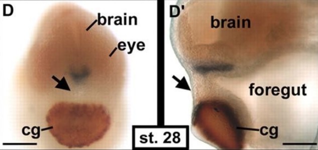 frzb (frizzled related protein) gene expression in Xenopus laevis embryo, assayed via in situ hybridization, NF stage 28, (D) anterior view, dorsal up, and (D') in midsaggital section, anterior left, dorsal up. Co-staining: muc2 (mucin 2, oligomeric mucus/gel-forming) marks cement gland (cg), and nrp1( neuropilin 1) marks brain and eyes in light orange.; arrows indicate the position of the presumptive primary mouth. |
