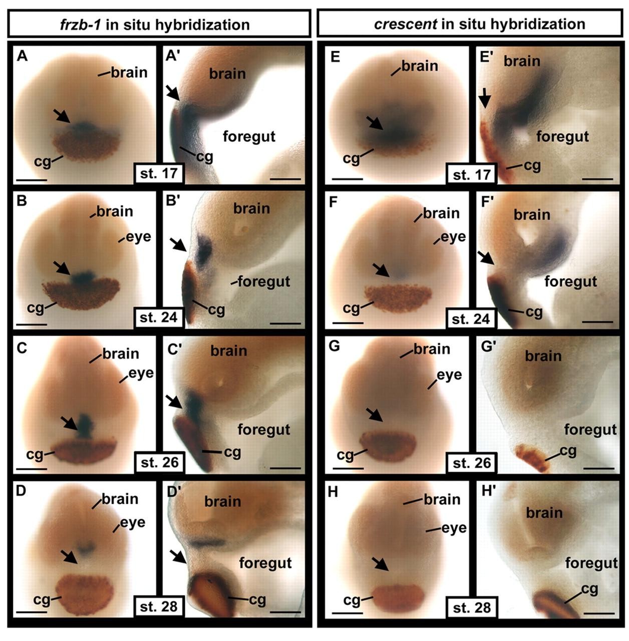 Fig. 2. In situ hybridization of frzb-1 and crescent mRNA during neurula and early tailbud stages. (A-Hâ²) In situ hybridization of frzb-1 (A-D) and crescent (E-H) during neurula and early tailbud stages. frzb-1 and crescent are stained purple/blue, the cement gland marker (XCG), dark red and the CNS-specific marker (nrp1), light orange. Arrows indicate the presumptive primary mouth. cg, cement gland. A-H are frontal views, scale bars: 200 μm; Aâ²-Hâ² are sagittal sections with anterior to the left, scale bars: 130 μm. |