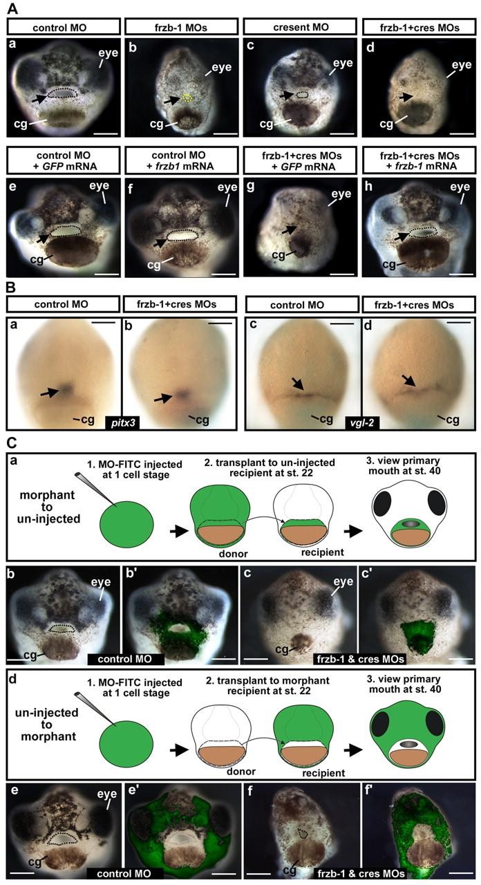 Fig. 3. frzb-1/crescent loss-of-function analysis. (A) frzb-1 and crescent loss of function using antisense morpholinos, and rescue by frzb-1 mRNA in whole embryos. Frontal views are shown, assayed at stage 40 in two to four independent experiments. cg, cement gland. Scale bars: 250 μm. Open primary mouth, black dotted line; closed stomodeum, yellow dotted line. (a-d) Morpholino injection (60-80 ng/embryo). (a) Control morpholino results in a normal primary mouth (100%, n=121). (b) Two frzb-1 start site morpholinos result in a very small stomodeum (97%, n=57). (c) A crescent splice blocking morpholino results in a smaller primary mouth (100%, n=50). (d) frzb-1 morpholinos (15 ng/embryo of each) and crescent morpholino (30 ng/embryo) result in neither stomodeum nor primary mouth (99%, n=66). (e-h) Rescue: 60 ng morpholino and 200 pg mRNA was injected/embryo. (e) Control morpholinos plus GFP mRNA have no effect (100%, n=45). (f) Control morpholinos with frzb-1 mRNA results in a normal primary mouth (100%, n=33). (g) frzb-1/crescent morpholinos plus GFP mRNA result in neither a stomodeum nor a primary mouth (94%, n=32). (h) frzb-1/crescent morpholinos plus frzb-1 mRNA results in a primary mouth opening (86%, n=55). Arrows indicate the primary mouth or region where it would form. (B) The primary mouth anlage is correctly specified. (a,b) Analysis of pitx3 expression by in situ hybridization in (a) control and (b) frzb-1/crescent morphant embryos. Note that pitx3 expression is present in the morphant. Scale bars: 200 μm. (c,d) Analysis of vgl-2 expression by in situ hybridization in (c) control and (d) frzb-1/crescent morphant embryos. Note that vgl-2 expression it is present in the morphant. Arrows indicate the primary mouth anlage. Scale bars: 200 μm. (C) Localizing morphant and wild-type tissue using face transplants. (a) Schematic of experimental design: donor morphant tissue (FITC labeled) was transplanted to uninjected sibling recipients. (b) The primary mouth is normal when donor tissue is derived from embryos injected with control morpholinos (100%, n=9). (bâ²) Overlay of b with FITC fluorescence, indicating the location of the donor tissue in the recipient. (c) When donor tissue is derived from frzb-1/crescent morphants, 83% of recipients do not form a primary mouth opening and 17% form a small stomodeum (n=12). These embryos also have abnormalities in surrounding tissues, pigment cells do not migrate normally and the face appears thinner. (câ²) Overlay of c with FITC fluorescence. (d) Schematic of experimental design: donor wild-type tissue was transplanted to morphants. (e) The primary mouth is normal when recipients are injected with standard control morpholinos (100%, n=7). (eâ²) Overlay of e with FITC fluorescence. (f) When recipients are frzb-1/crescent morphants, a primary mouth is present (80%, n=15). Although the primary mouth is not a normal shape, a deep invagination forms, followed by perforation. (fâ²) Overlay of f with FITC fluorescence. |
