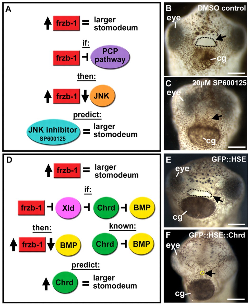 Fig. 6. Frzb-1 does not regulate Wnt/PCP or Bmp signaling. Frontal views, assayed at stage 40, from 2-3 independent experiments. Open primary mouth, black dotted line; closed stomodeum, yellow dotted; cg, cement gland. Black arrows indicate the primary mouth or region where it would form. Scale bars: 250 μm. (A) Schematic showing the prediction that if frzb-1 inhibits the PCP pathway, JNK inhibition would mimic frzb-1 overexpression. (B) Treatment with 1% DMSO results in a normal primary mouth (100%, n=15). (C) Treatment with 20 μm SP600125 results in neither a stomodeum nor a primary mouth (100%, n=15). (D) Schematic showing the prediction that if frzb-1 inhibits BMP signaling, increased Chordin would phenocopy frzb-1 overexpression. (E) The control GFP::HSE results in a normal primary mouth (100%, n=30). (F) GFP::HSE:chrd results in a small stomodeum (63%, n=32). |