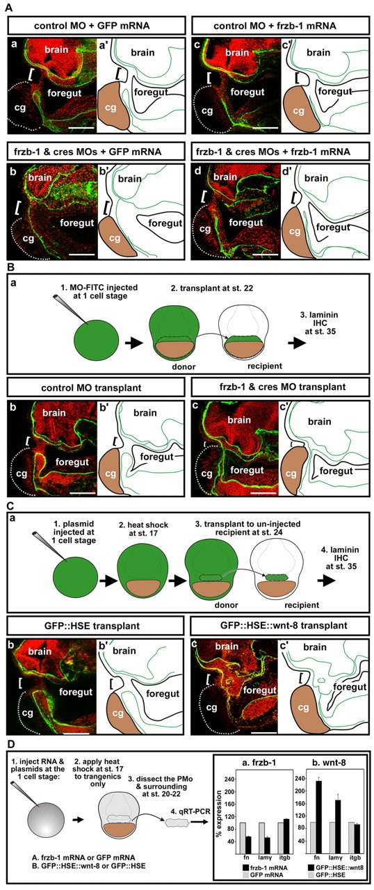 Fig. 7. Laminin persists in the primary mouth region when Frzb-1/Crescent are depleted or when wnt-8 is overexpressed. Sagittal sections (anterior to the left) assayed at stage 35-37, in 2-3 independent experiments. Laminin is immunolabed green, nuclear propidium iodide, red; cement gland is outlined by a dotted gray line. Panels denoted by primes are tracings of Laminin immunolabeling (green). Bracket indicates the presumptive primary mouth; cg, cement gland. Scale bars: 170 μm. (A) Laminin persistence in frzb-1/crescent morphants is specific. (a) Control morpholino and GFP mRNA results in a normal absence of Laminin in the presumptive primary mouth (100%, n=10). (b) In frzb-1/crescent morphants (also injected with control GFP mRNA), Laminin persists in the primary mouth region (87%, n=10). Note that similar phenotypes were seen in morphants injected without GFP mRNA. (c) Control morpholino and frzb-1 mRNA (200 pg) results in a normal absence of Laminin in the presumptive primary mouth (n=10). (d) Co-injection of frzb-1/crescent morpholinos and frzb-1 mRNA restores the absence of Laminin in 70% of morphants (n=10). (B) Laminin persists in embryos locally depleted of frzb-1/crescent. (a) Schematic of the experimental design. (b) Recipients receiving tissue injected with control morpholino and GFP mRNA have a normal absence of Laminin (100%, n=7). (c) Eighty-nine percent of recipients receiving tissue from frzb-1/crescent morphants have persistent Laminin (n=9). (C) Temporal and spatial overexpression of Wnt-8 results in persistent Laminin. (a) Schematic of the experimental design. (b) Recipients receiving tissue injected with GFP::HSE have a normal absence of Laminin (91%, n=11). (c) Seventy-five percent of recipients receiving tissue from embryos injected with GFP::HSE::wnt-8 have persistent Laminin (n=12). (D) Wnt signaling regulates the expression of basement membrane components. Schematic depicts experimental design. Results are an average of two independent experiments. (a) Increased frzb-1 results in fibronectin mRNA that is 45% of the control level, laminin-γ1 mRNA that is 48% of the control level andβ 1-integrin that is 112% of the control level (n=20). (b) Temporally increased wnt-8 results in fibronectin mRNA that is 232% of the control level, laminin-γ1 mRNA that is 170% of the control level and β1-integrin mRNA that is 93% of the control levels (n=20). |