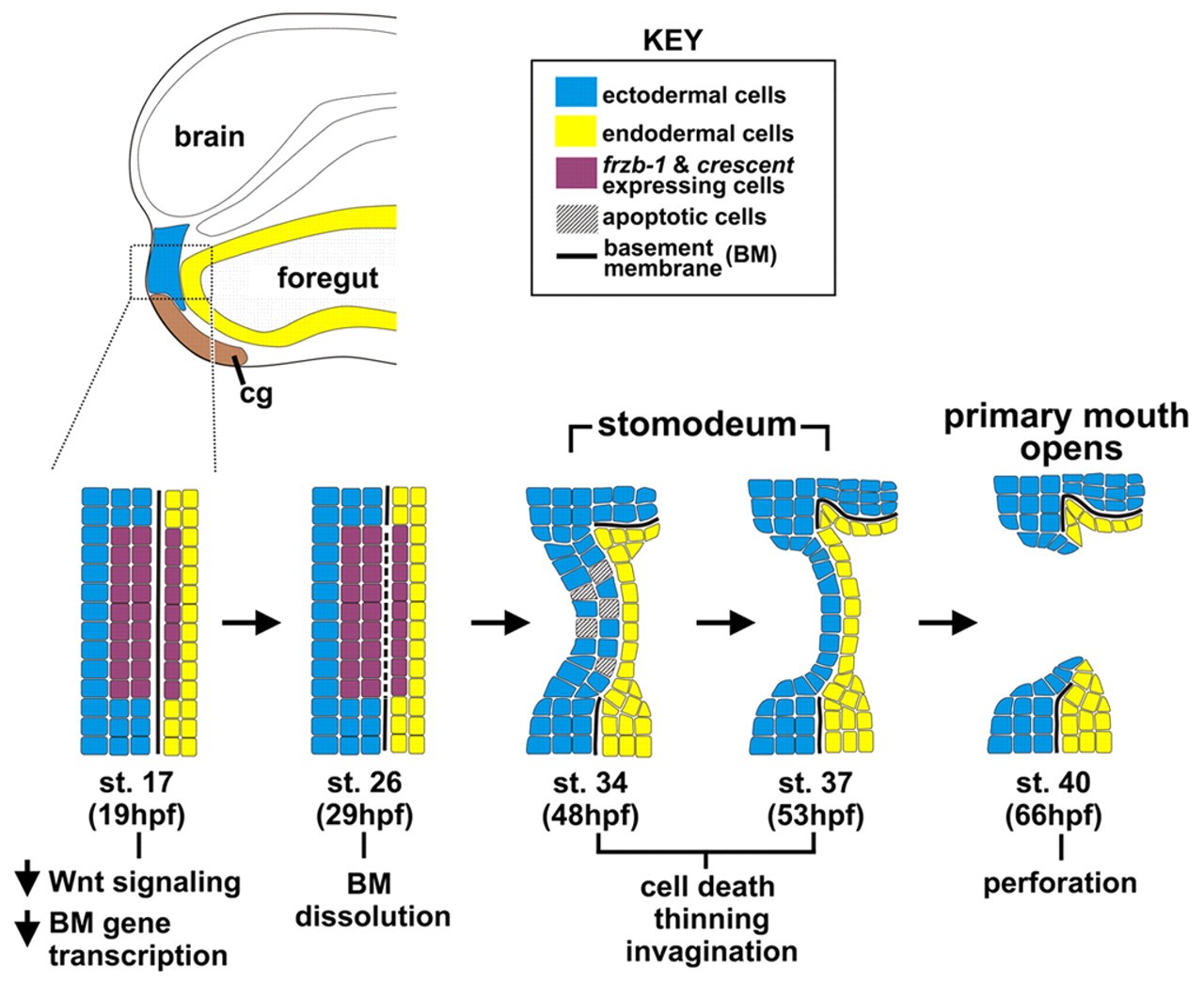 The primary mouth forms from ectoderm and endoderm at the extreme anterior of the embryo, a conserved mesoderm-free region. In Xenopus, a very early step in primary mouth formation is loss of the basement membrane between the ectoderm and endoderm. In an unbiased microarray screen, we defined genes encoding the sFRPs Frzb-1 and Crescent as transiently and locally expressed in the primary mouth anlage. Using antisense oligonucleotides and ;face transplants', we show that frzb-1 and crescent expression is specifically required in the primary mouth region at the time this organ begins to form. Several assays indicate that Frzb-1 and Crescent modulate primary mouth formation by suppressing Wnt signaling, which is likely to be mediated by beta-catenin. First, a similar phenotype (no primary mouth) is seen after loss of Frzb-1/Crescent function to that seen after temporally and spatially restricted overexpression of Wnt-8. Second, overexpression of either Frzb-1 or Dkk-1 results in an enlarged primary mouth anlage. Third, overexpression of Dkk-1 can restore a primary mouth to embryos in which Frzb-1/Crescent expression has been inhibited. We show that Frzb-1/Crescent function locally promotes basement membrane dissolution in the primary mouth primordium. Consistently, Frzb-1 overexpression decreases RNA levels of the essential basement membrane genes fibronectin and laminin, whereas Wnt-8 overexpression increases the levels of these RNAs. These data are the first to connect Wnt signaling and basement membrane integrity during primary mouth development, and suggest a general paradigm for the regulation of basement membrane remodeling.