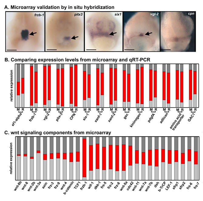 Fig. S1. Microarray analysis. (A) Frontal view of embryos labeled by in situ hybridization for genes indicated. Arrows indicate the presumptive primary mouth. cg, cement gland. Scale bars: 200 . cDNAs used for making in situ probes are vgl-2 (GA# BC056001, image clone 4930090, Open BioSystems), CPN (GA# BC059995, image clone 4030455, Open Biosystems), pitx-3 GA# AF297713.1, provided by Hollemann (Pommereit et al., 2001) and six-1 GA# AF279254, provided by Moody (Pandur and Moody, 2000). (B) Expression levels of genes from Table S1, as determined by microarray (M) and qRT-PCR (R). Shading and colors match scheme shown in Fig. 1, in which the anterior dorsal region (AD) is shaded dark gray, the cement gland and ventral region (CG+V) light gray, and the presumptive primary mouth (PMo) is colored red. (C) Expression of Wnt pathway components in the primary mouth (red) relative to the anterior dorsal region (AD; dark gray), and a ventral region, including the ventral half of the cement gland (CG+V; light gray) as determined by microarray. The expression level of each gene was plotted relative to each other so that a single bar represents the total expression in all three regions, scaled to 100. In the primary mouth anlage expression of wnt-8, wnt-8b, wnt-3a and wnt-2 is significantly depleted (<6% relative to the flanking regions) and expression of wnt-4, β-catenin, axin and the Frizzled receptors frz-3 and frz-9 are also depleted (<20% relative to the flanking regions). Other Wnt inhibitors, dkk-1 and wif-1, are enriched (>57% relative to the flanking regions). |