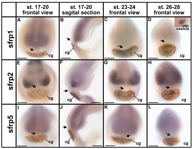 Fig. S2. In situ hybridizations to show expression patterns sfrps during neurula and early tailbud stages.sfrp1 (A-D), sfrp2 (E-H) and sfrp5 (I-L) are labeled purple/blue, whereas the cement gland marker, XCG, is labeled orange. A, C and E are frontal views; B, D and F are sagittal sections (anterior to the left) of the same stage; G-L are frontal views. Arrows indicate the presumptive primary mouth. cg, cement gland. Scale bars: 200 . cDNAs used for making in situ probes were obtained from Open Biosystems; sfrp-1 (GA# BC106360, image clone 7392081), sfrp-2 (GA# BC044687, image clone 5571003) and sfrp-5 (GA# BC082632, image clone 5512233). |