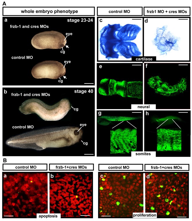 Fig. S3. Characterizing the morpholino phenotype. (A, parts a,b) Whole embryo phenotype. (a) frzb-1/crescent morphants at stage 23-24 compared with control morpholino-injected embryo. Note the overall similarity in the embryos, suggesting that the positioning and specification of many of the anterior structures are normal. (b) frzb-1/crescent morphants at stage 40-41 compared with control morpholino-injected embryo. Note the curved axis and reduced head structures. Scale bars: 1000 (c,d) Alcian Blue staining of cartilage at stage 45 in (c) control embryos, and (d) frzb-1 and crescent morphants. Note the almost complete lack of Alcian Blue staining in the morphants. Scale bars: 340 . (e,f) Axon tracts of the CNS at stage 40 were visualized by acetylated tubulin immunohistochemistry in (e) controls and (f) frzb-1/crescent morphants. Note the unorganized axon tracts in frzb-1/crescent morphants. Scale bars: 370 . (g,h) Phalloidin labeling of somites at stage 45 in (g) controls and (h) frzb-1/crescent morphants, using F-actin labeling with Phalloidin conjugated to Alexa Fluor 488. Scale bar: 1200 . Insets show a 100magnification of the somites, note the unorganized muscle fibers in frzb-1/crescent morphants. Scale bar: 1200 . (B, parts a,b) Embryos and tadpoles were processed for terminal deoxynucleotidyl transferase-mediated dTP nick-end labeling (TUNEL) as described (Dickinson and Sive, 2006), using the Apoptag kit (Chemicon). TUNEL labeling (green) in the primary mouth region of (a) control and (b) frzb-1/crescent morphants; embryos were counterstained with propidium iodide (red). Note that there are few TUNEL-positive cells in the presumptive primary mouth at stage 24-26, and no observable difference in frzb-1/crescent morphants (n=5; two experiments, not quantified). Scale bars: 100 . (c,d) Phosho-histone3 (pH3) immunohistochemistry (green) using a polyclonal anti-phosphohistone3 antibody diluted 1:1000 and a secondary goat anti-rabbit Alexa Fluor-conjugated antibody diluted 1:500, counterstained with propidium iodide (1:1000). (c) Control. (d) frzb-1/crescent morphants have similar amounts of pH3-positive cells to controls (6.33%, no significant difference) in the presumptive primary mouth regions (four stages examined, n=5 at each stage, one stage in one experiment quantified). Arrows indicate the presumptive primary mouth. cg, cement gland. Scale bars: 100 . |